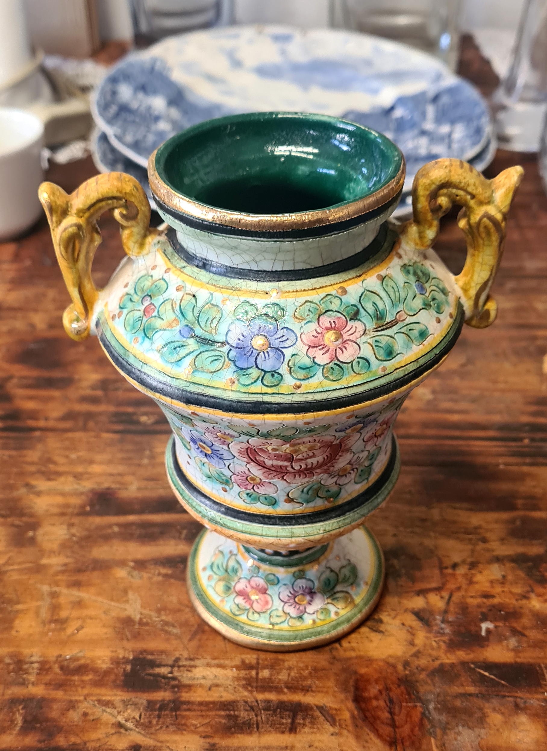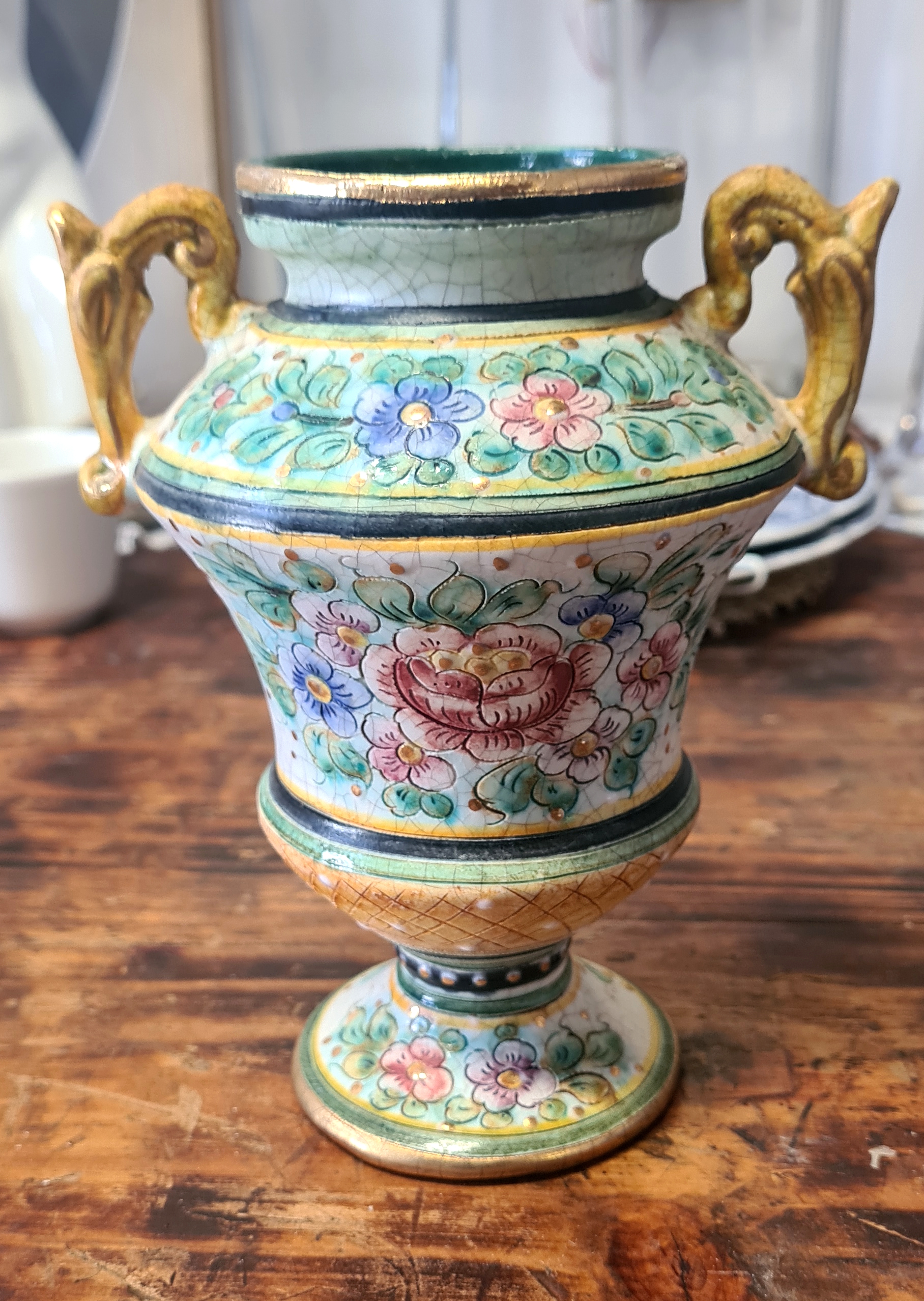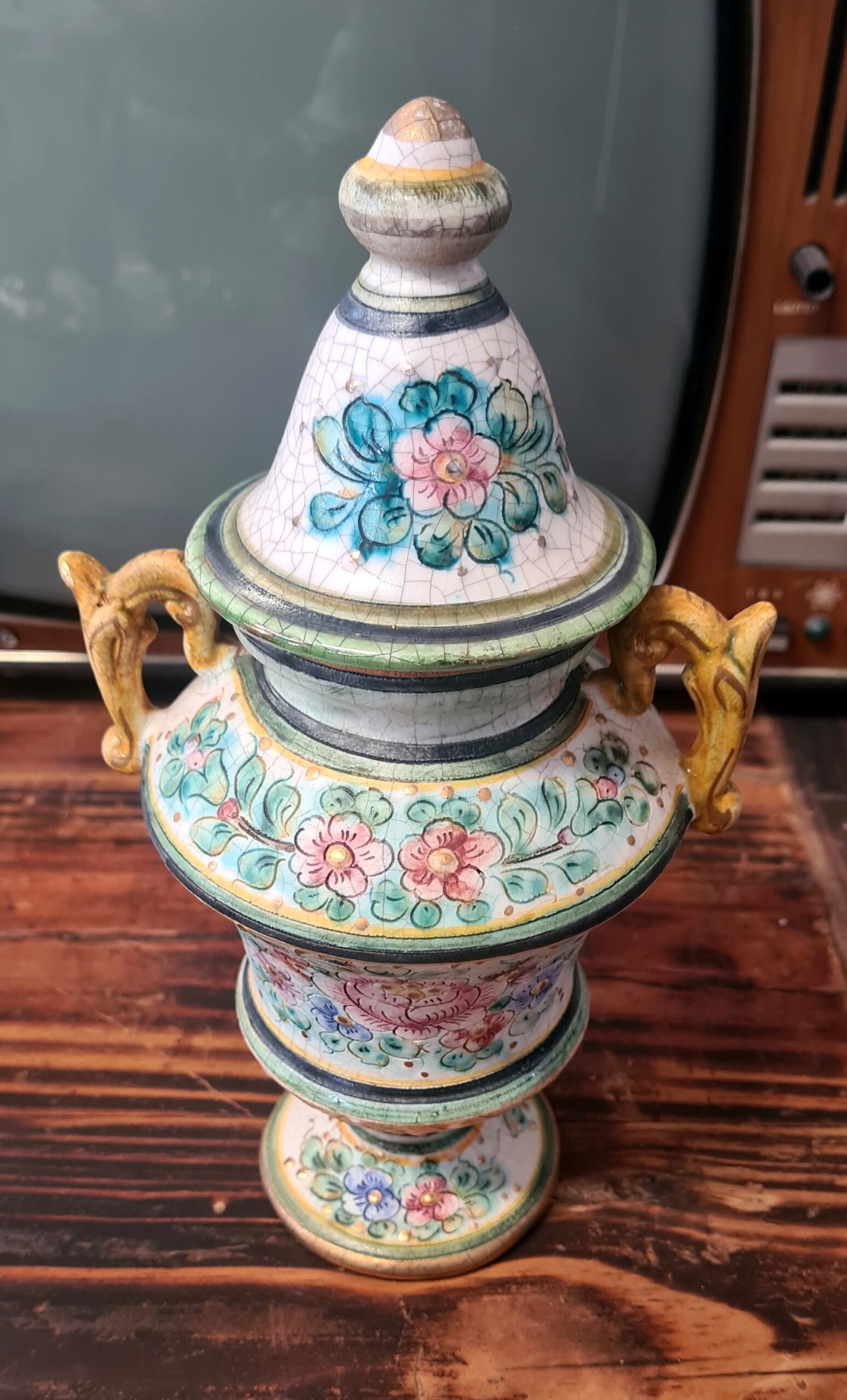 Anfora di Deruta in ceramica con coperchio, decorata a mano.