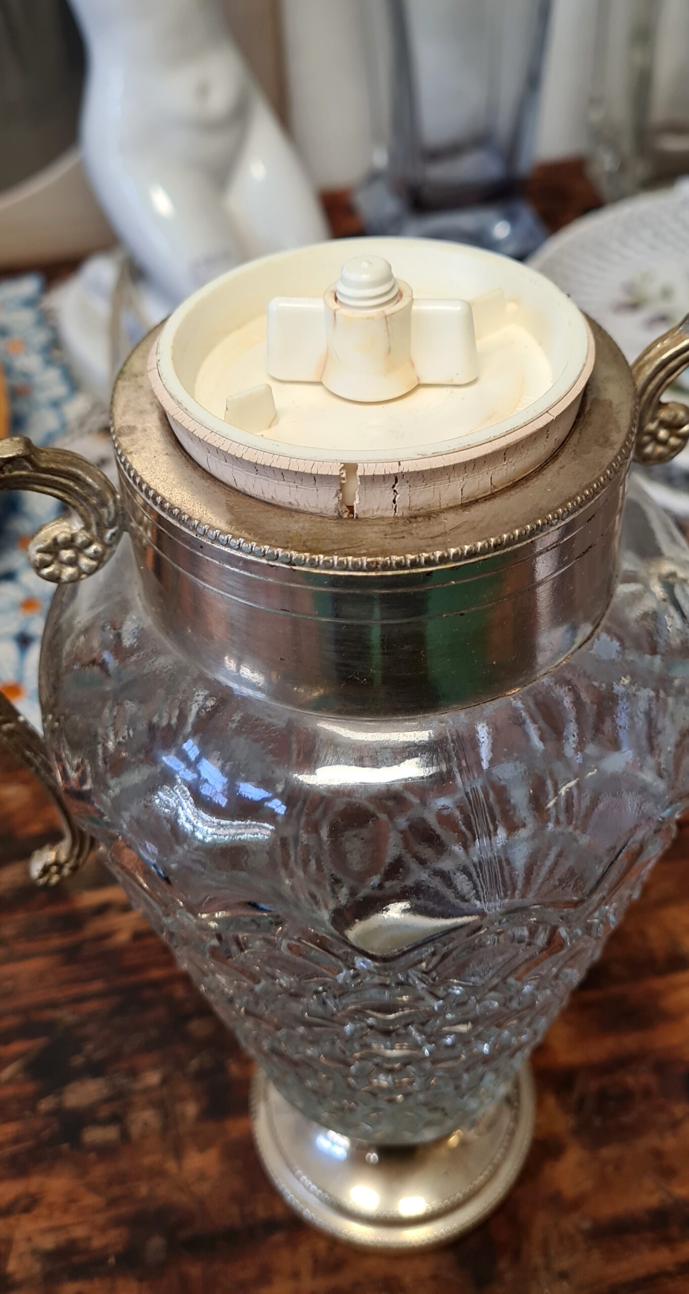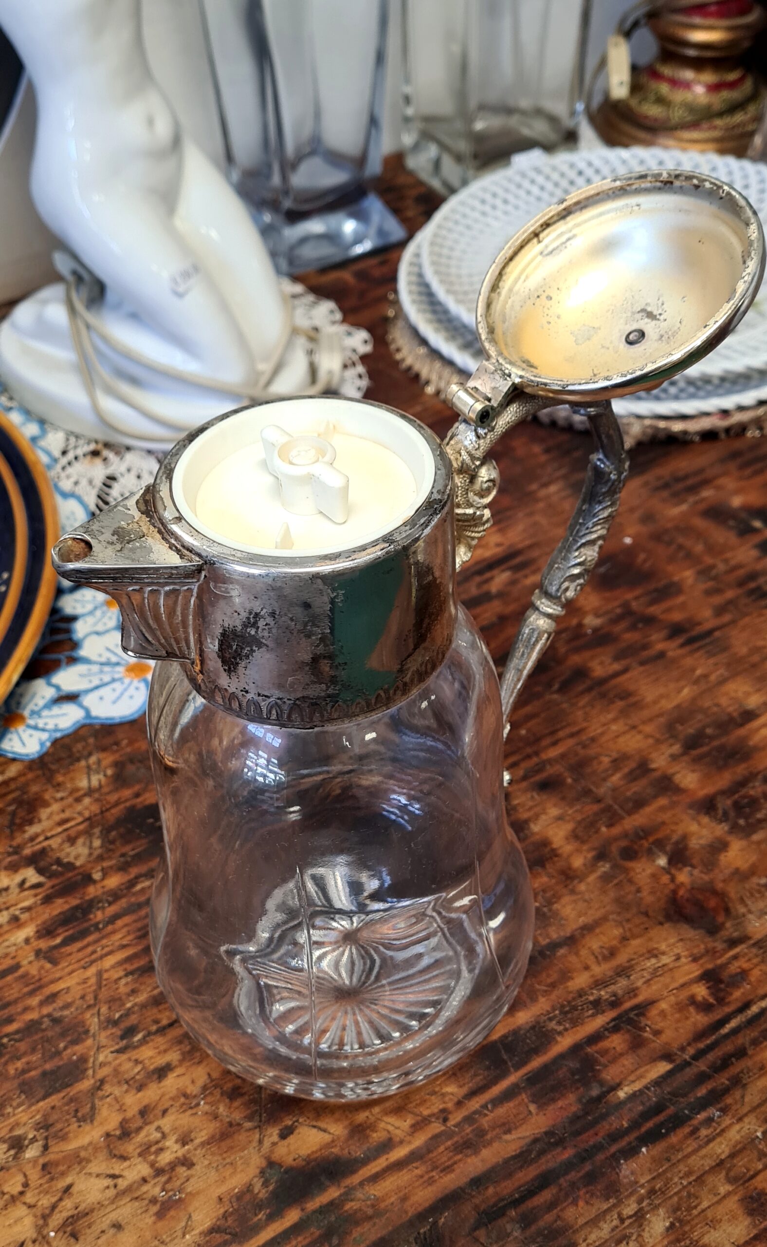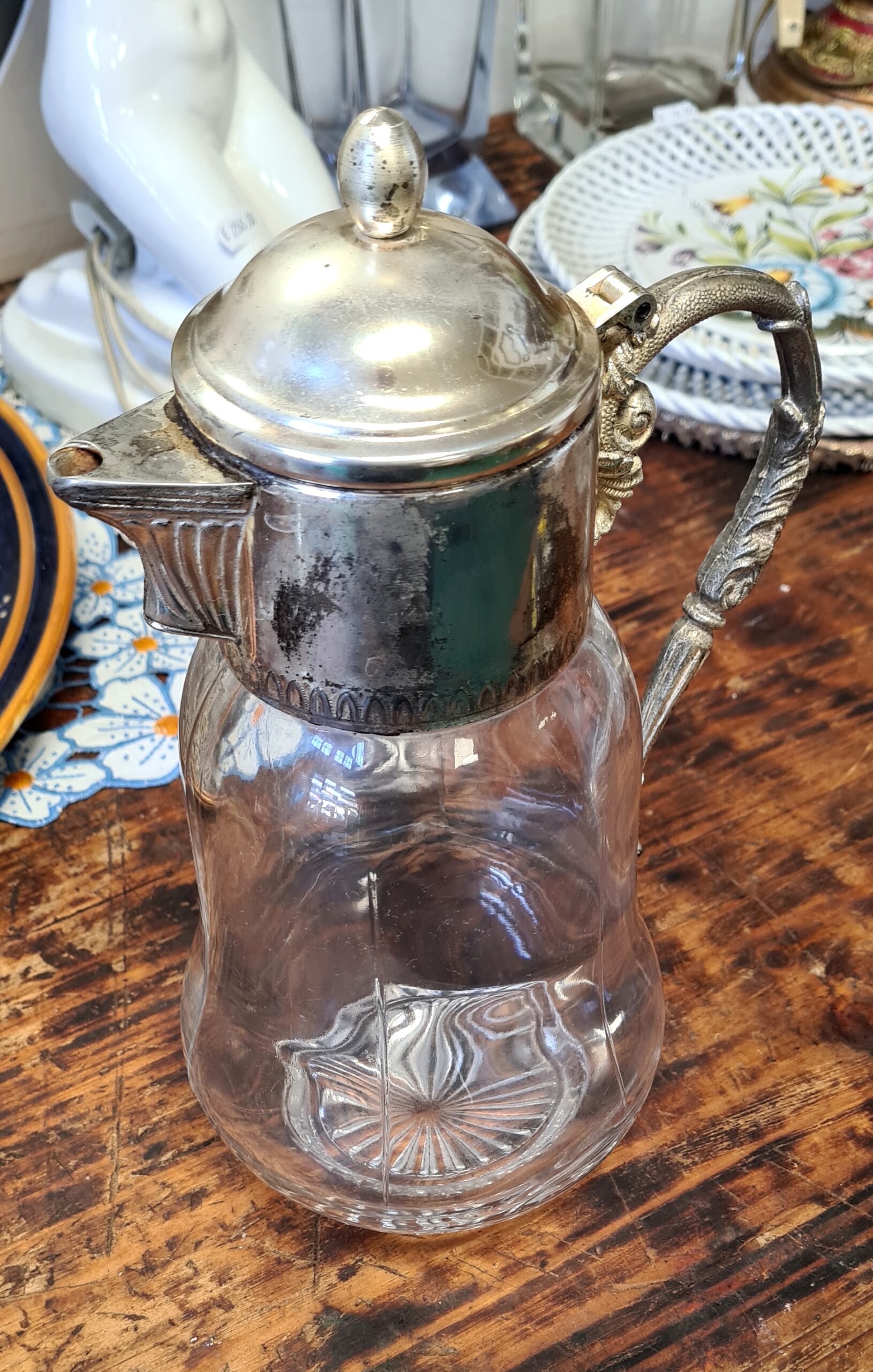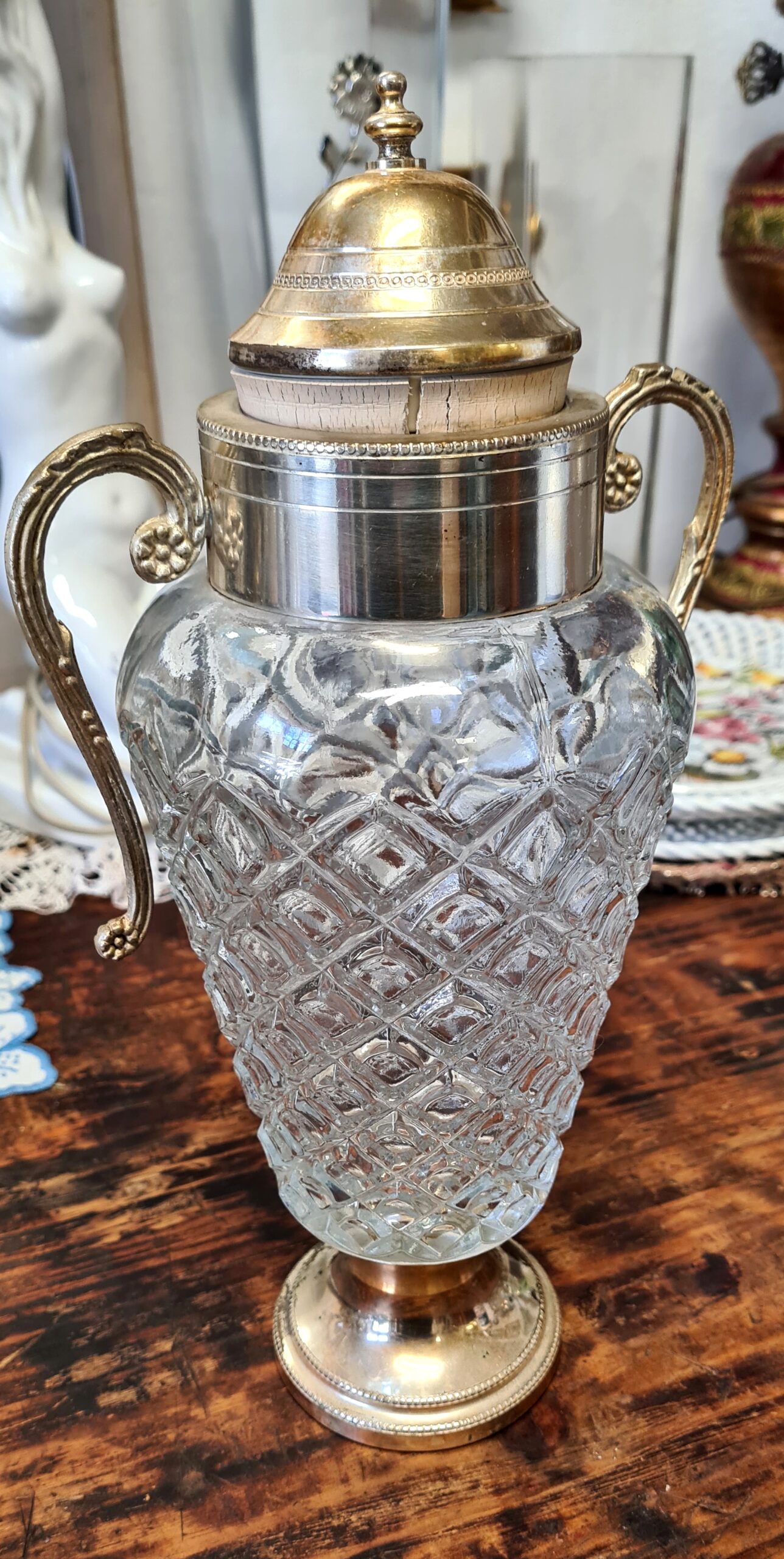 Coppia di brocche in cristallo argentate, utilizzabili per liquori e sciroppi.