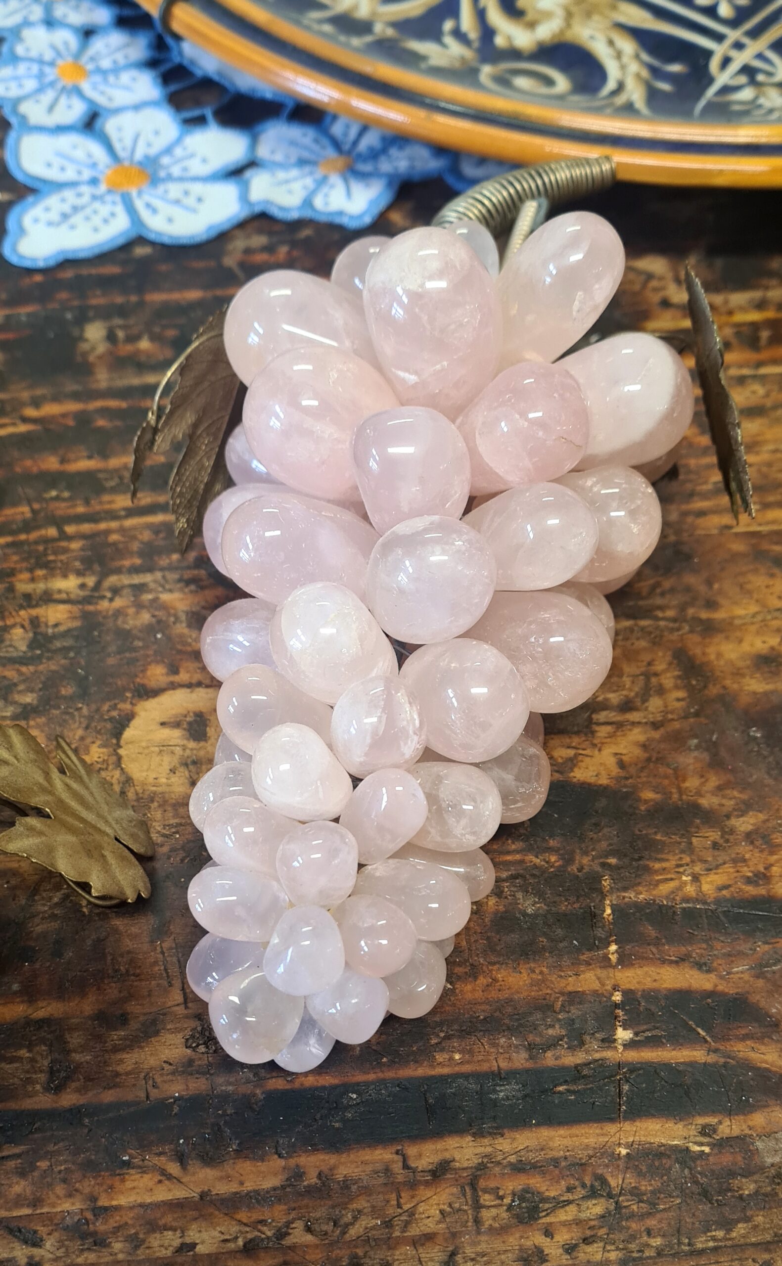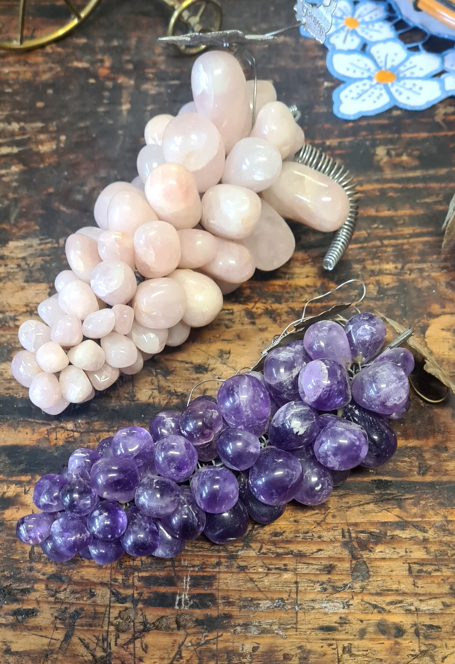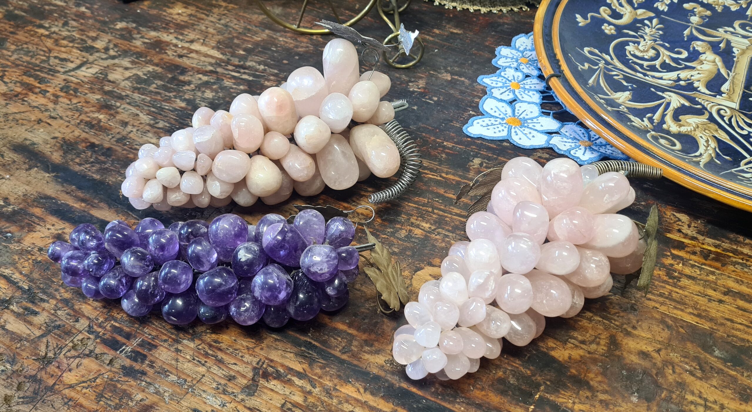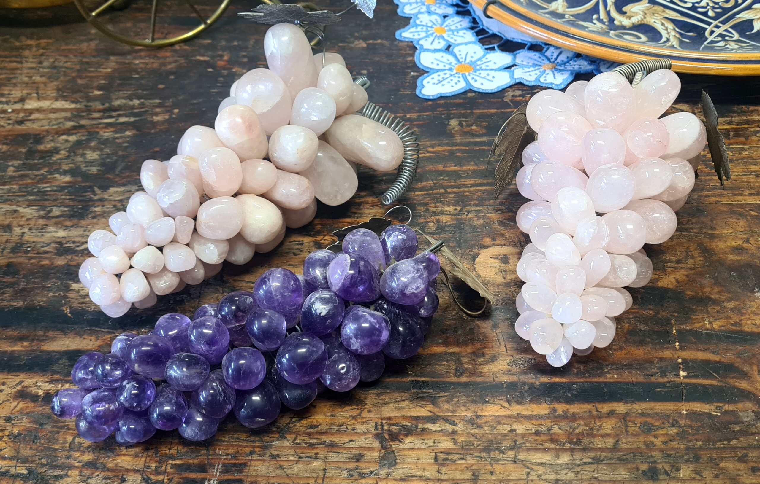 Tre Grappoli d’uva in ametista e quarzo rosa.