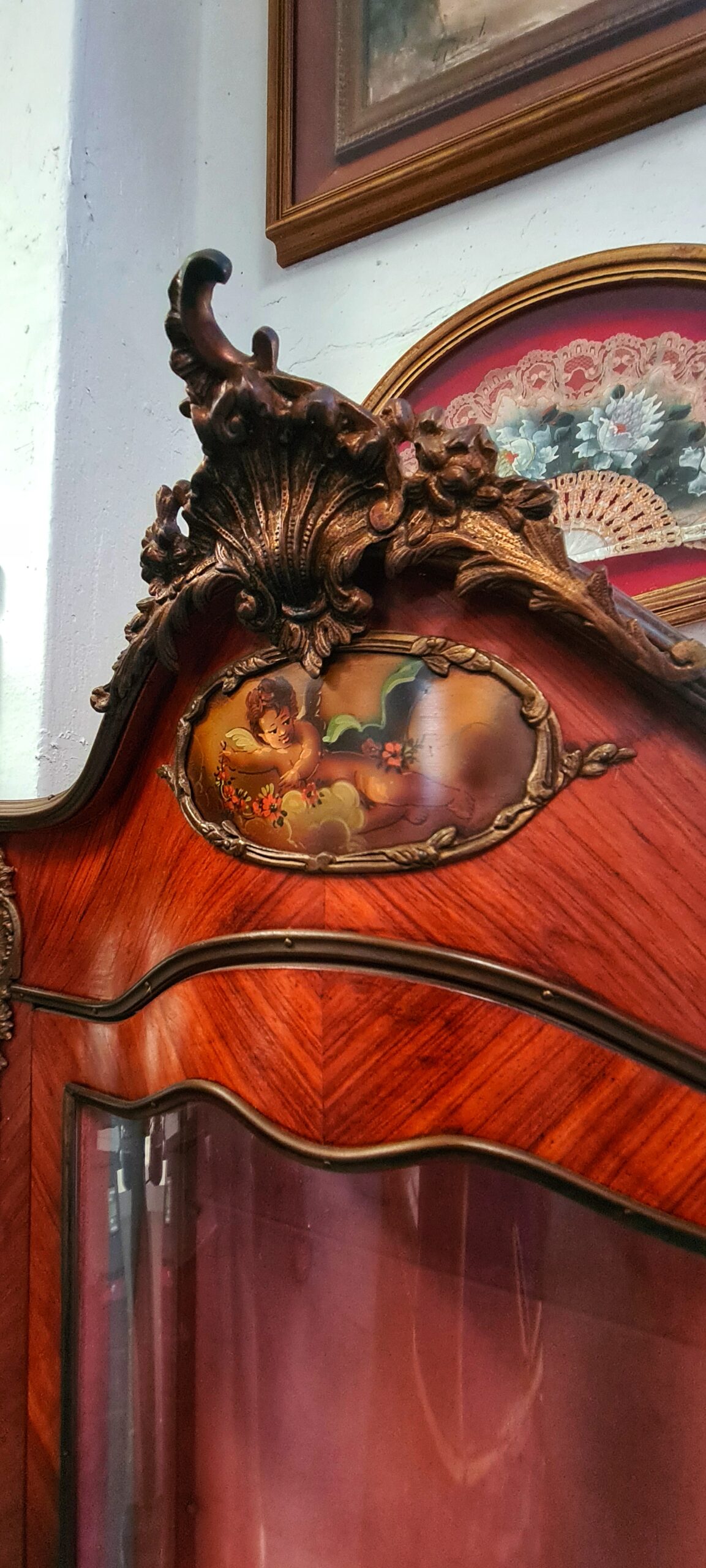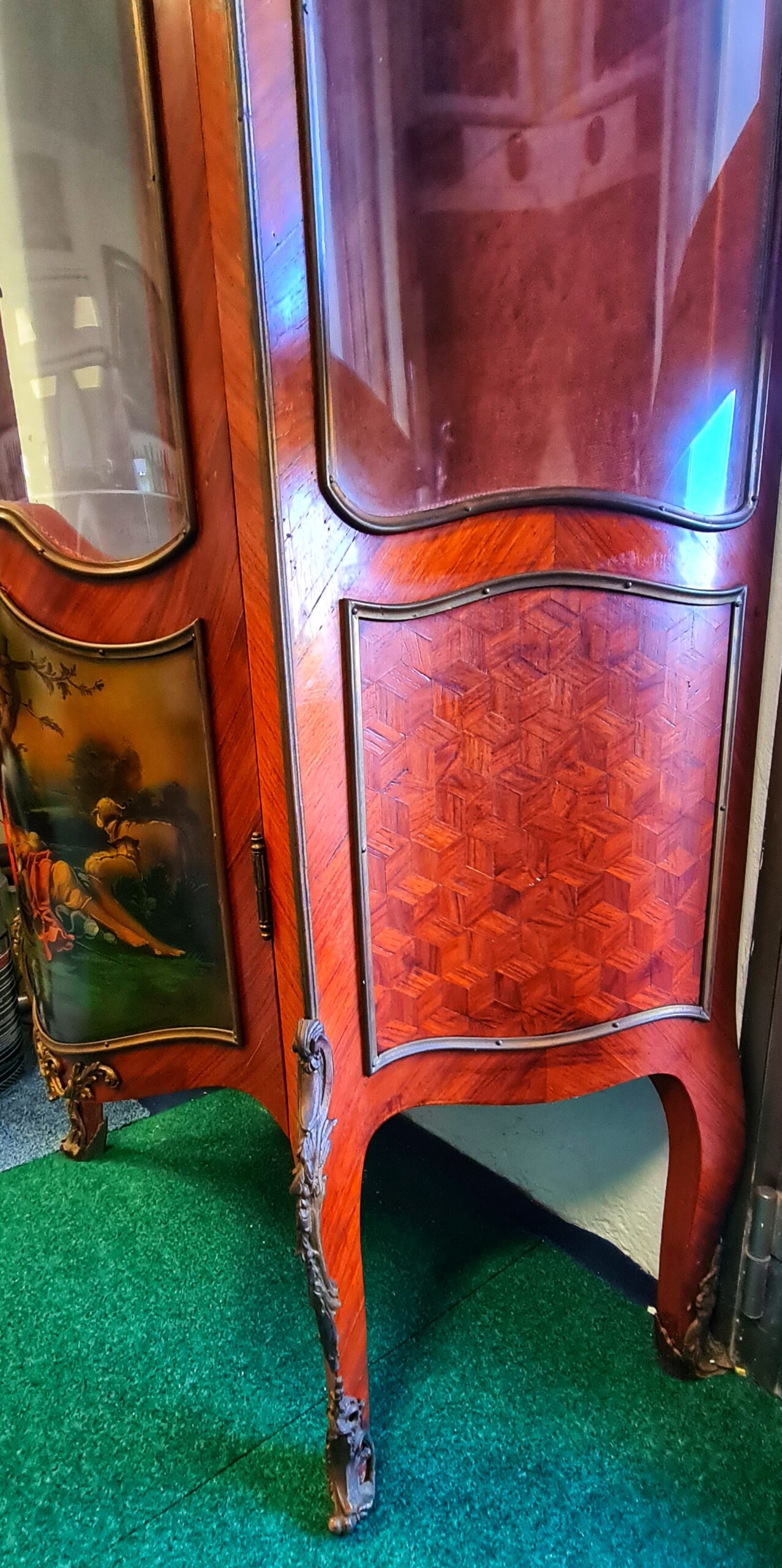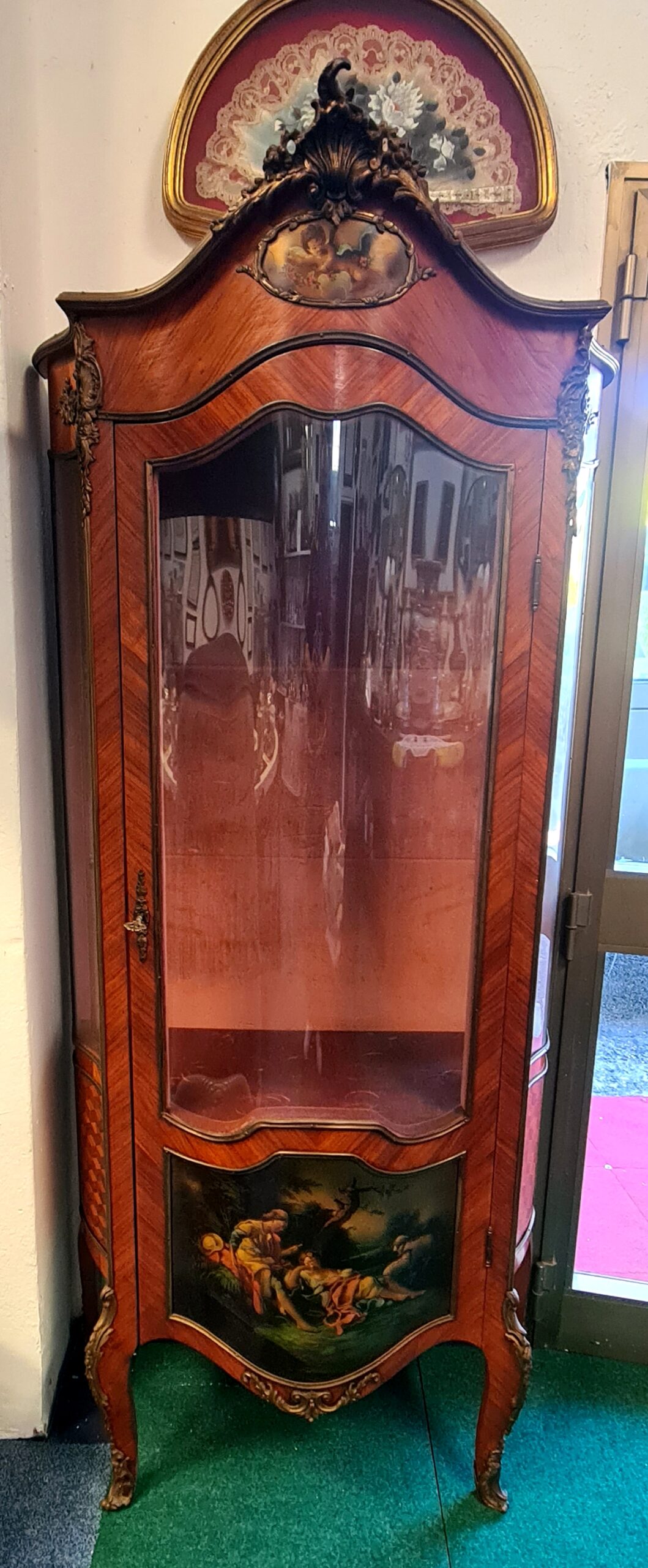 Elegante Vetrina in stile Luigi XV, decorata con bronzi e tavole dipinte a mano.